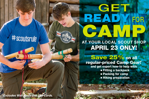 Blast Through Your Checklists and Save! Summer Campers: Get the gear and know-how you need on Saturday, April 23rd from 10am till 4pm when you join us for our annual GET READY FOR CAMP DAY at your local participating Scout Shop! We're proud to host this great gear-up opportunity, so we've included a special 25% OFF REGULAR-PRICED CAMPING GEAR** available exclusively during this in-store event. Plus, pick up some awesome how-to tips while you're here, including: Fitting a Backpack, Packing for Camp, and Hiking Preparation. **25% savings offer is only available for retail purchases on camp gear made in participating Scout Shops during the day of the event. Excludes Wall Tents and Gift Cards. Does not apply to unit purchases, phone orders, or wholesale orders. Not valid on previous purchases or orders; may not be combined with any other offer or discount. Selection varies by location. Discount is applied at time of purchase. Savings do not apply to shipping, handling, or taxes. CONTACT RIVER CITY SCOUT SHOP FOR ALL THE DETAILS. 916-649-1800 |