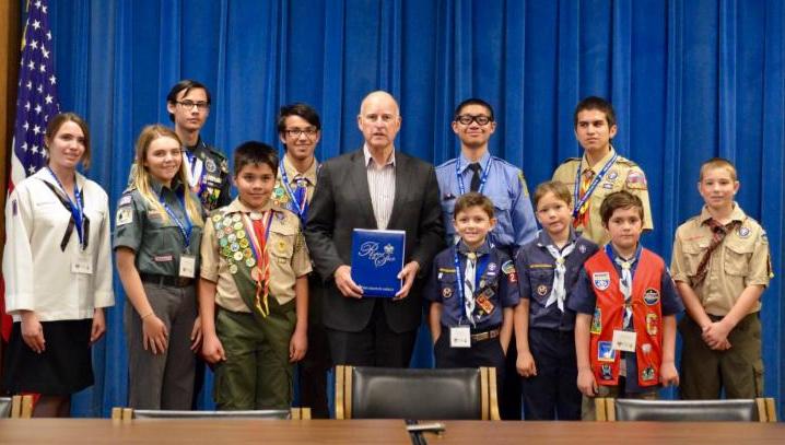 Among the eight delegates, two were from the Golden Empire Council. Meghan, a Sea Scout from Ship 777 and Dave, a Cub Scout from Pack 217 in Fair Oak, accompanied other youth from several other councils. The BSA programs represented included: Cub Scouts, Boy Scouts, Venturing and Sea Scouts, and Exploring. Did you know that Governor Brown himself attained the rank of Life Scout and staffed scout camp as a youth. He was also the Scouting for Food Honorary Chair in 1999 for the San Francisco Area Bay Council. The report presented, featured a recap of BSA accomplishments in California during the year, such as the over 2.2 million hours of service Scouts provided to their communities which if these volunteers we paid would exceed $50 million dollars. Of particular note, 4,911 Scouts earned the rank of Eagle Scout in California. Golden Empire alone contributed 550 Eagle Scout which is over 11% of the total! In addition to the 21 life skills merit badges required to earn the Eagle Scout rank, each Scout completed an extensive service project that he planned, organized, lead, and managed, demonstrating proficiency in leadership, service, and outdoor skills at multiple levels.